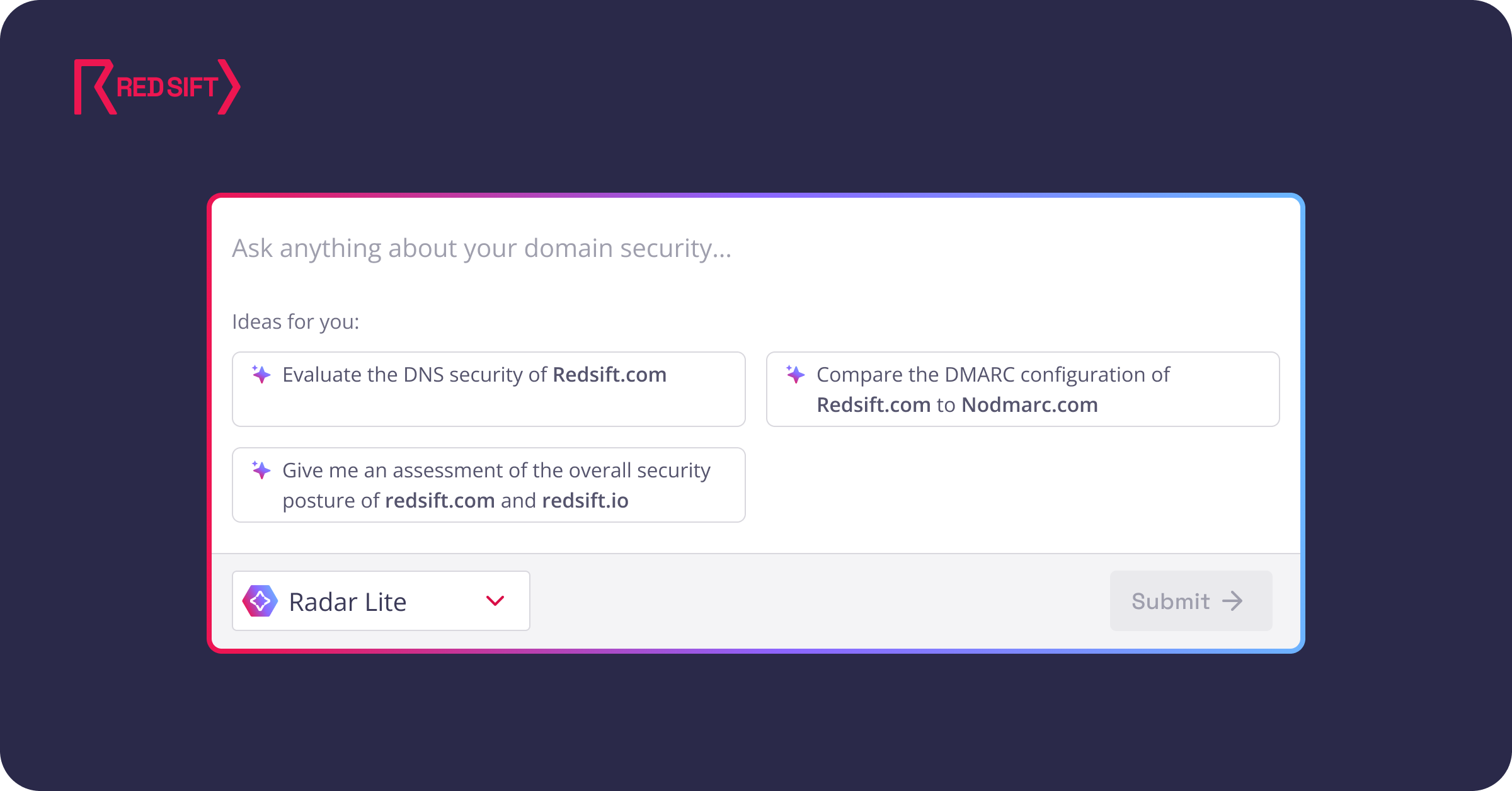 Visit redsift.com/radar-lite, ask a question about your domain and see how AI-powered security analysis should work.